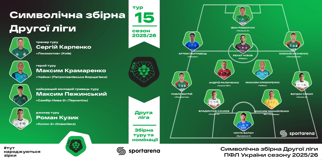 Всеукраїнський сайт Sport Arena визначив символічну збірну 15-го туру Другої ліги 2025/26. Там є представники Локомотиву